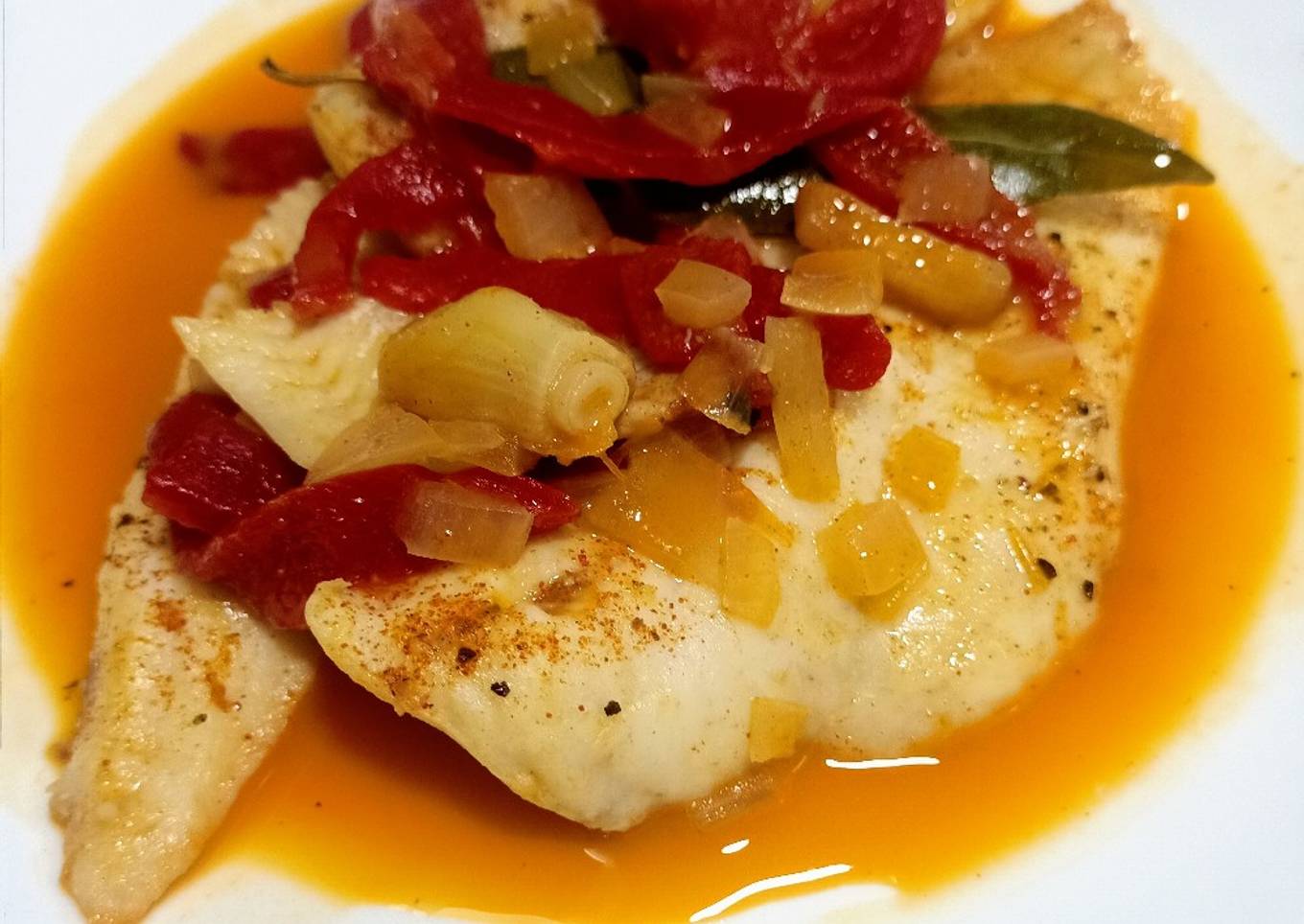 Filetes de merluza con pimientos de piquillo y ajos confitados