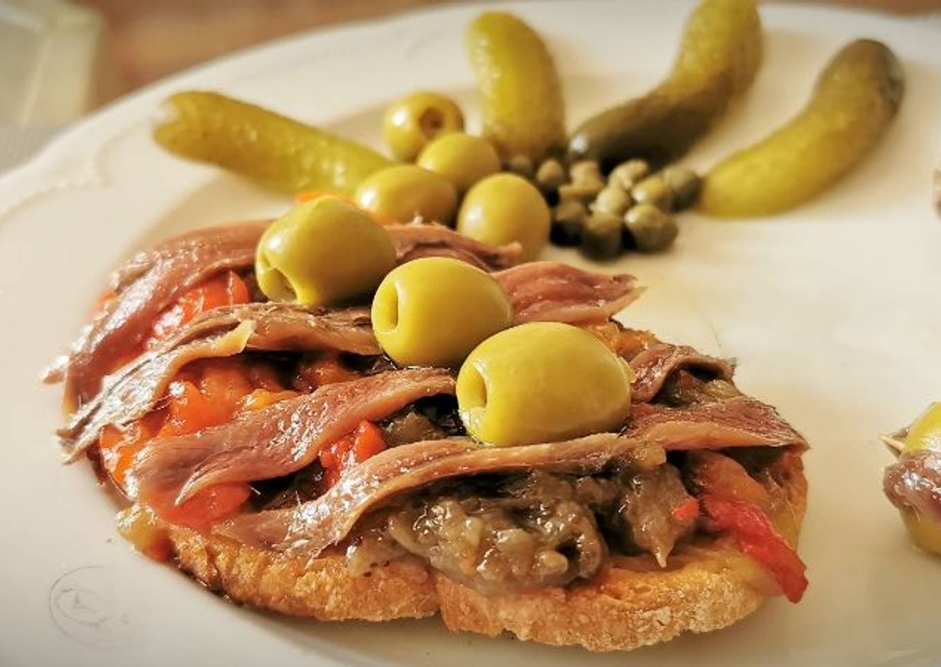 La traducción al castellano es "Tostada de Pimientos asados o escalivados con Anchoas", una receta muy típica Catalana y que es una delicia.