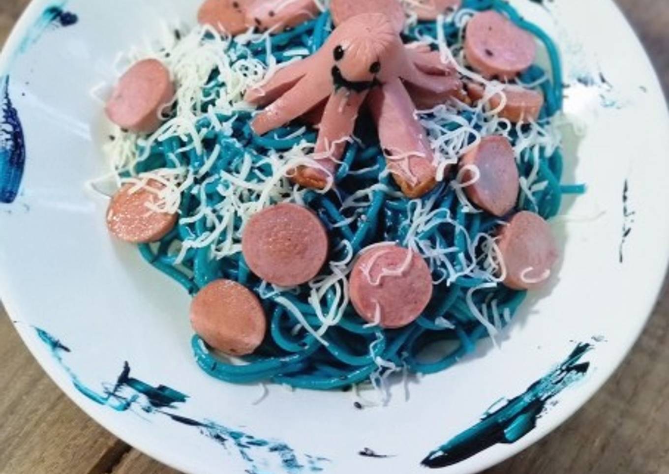 Spaghetti azules con pulpitos de salchicha