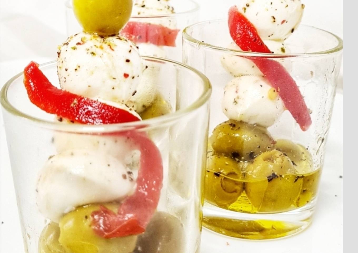 Aperitivo de mozzarella, aceitunas y pimiento de piquillo