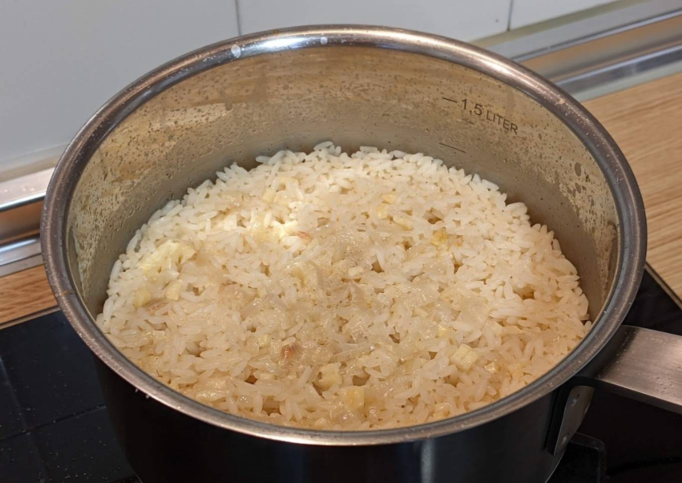 - Añadimos el arroz y lo salteamos un poco. Echamos dos vasos de agua o caldo de ave, mezclamos, llevamos a ebullición, lo dejamos cocinar con la tapa puesta hasta que se consuma el líquido y listo a disfrutar del manjar.