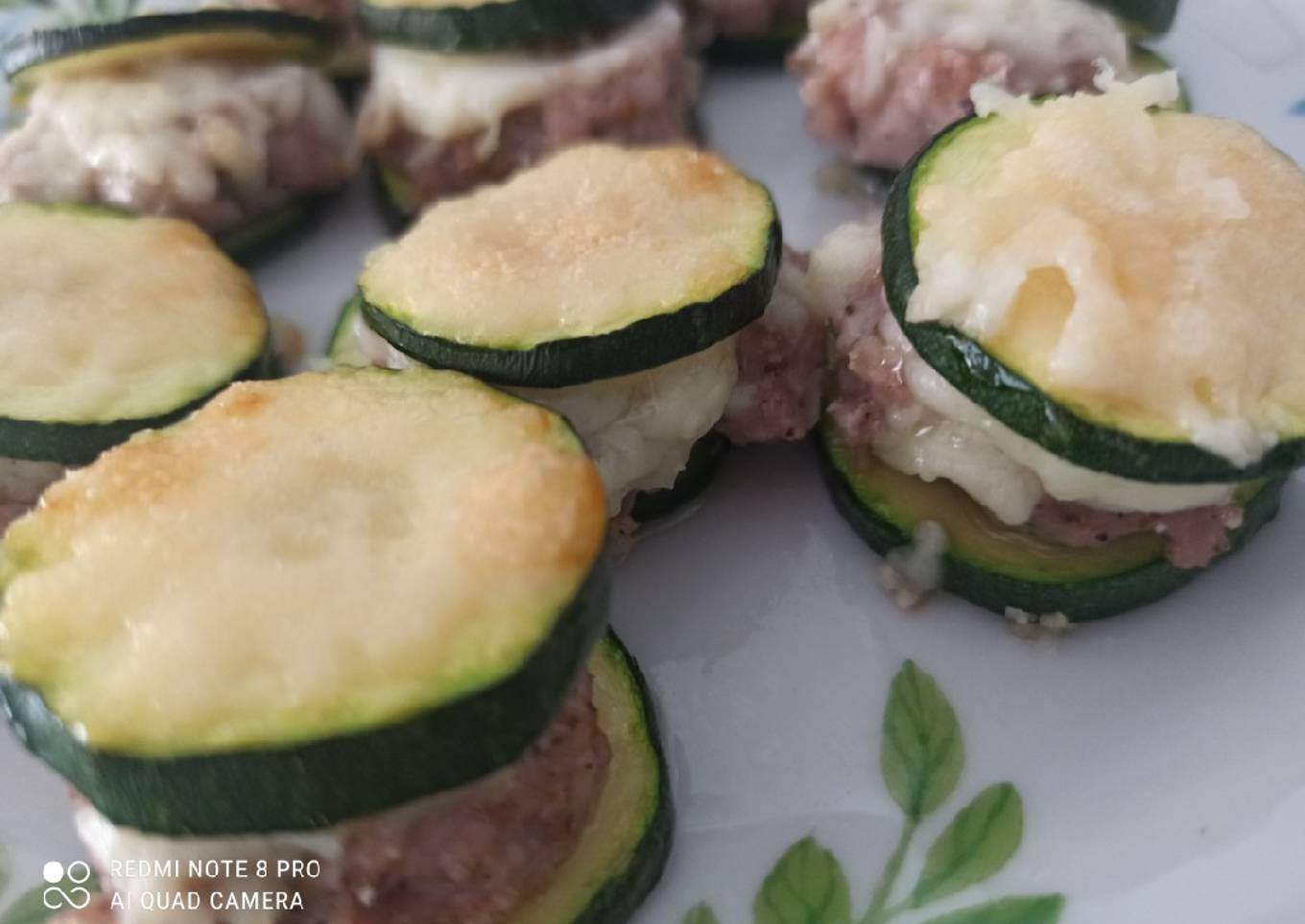 A continuación, montar una bolita en cada rodaja del calabacín. Encima de la carne poner un montoncito de mozzarella y tapar con otra rodaja de calabacín.