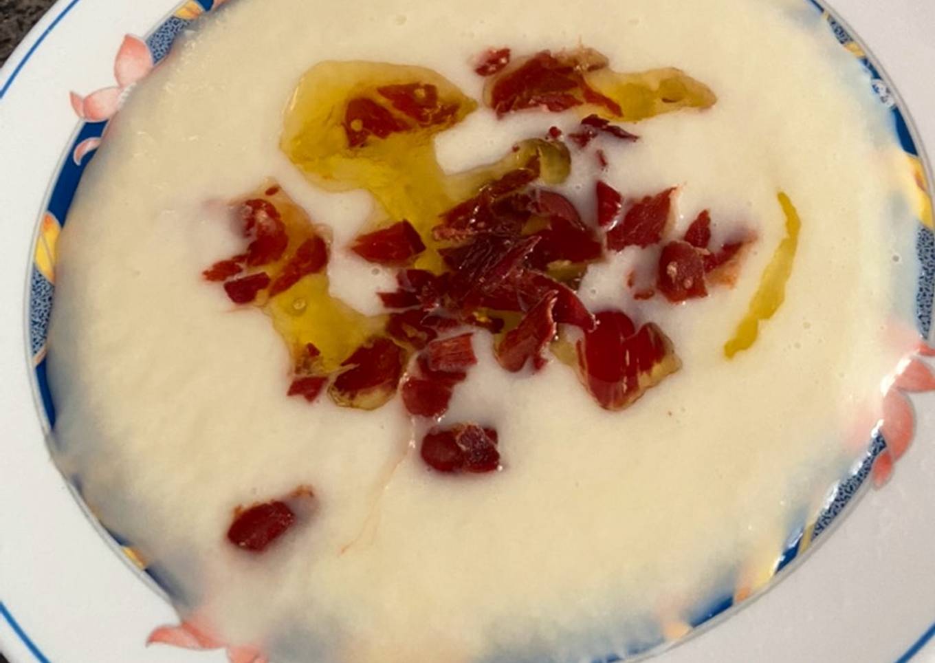 - Y por último, sírvelo frío acompañado del crujiente de jamón y un chorro de AOVE. ¡ Buen provecho! ¡ espero que os guste!