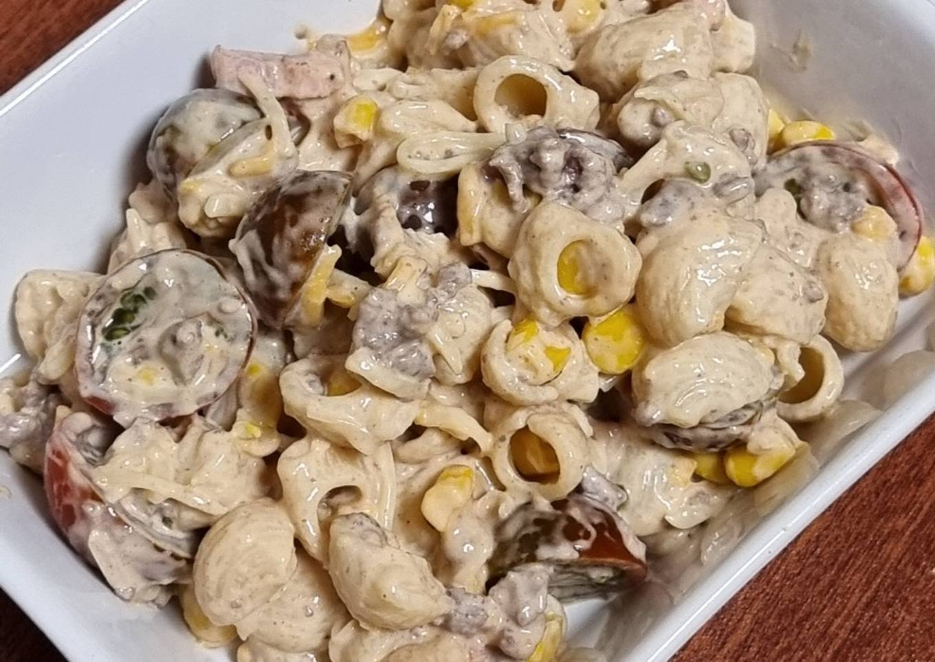 - En ese mismo bol echamos la pasta cocida, el bacon frito, la carne picada previamente salteada, los tomates cherrys cortados por la mitad, el maíz cocido y el queso rallado. Salpimentamos. Mezclamos muy bien, y servimos.