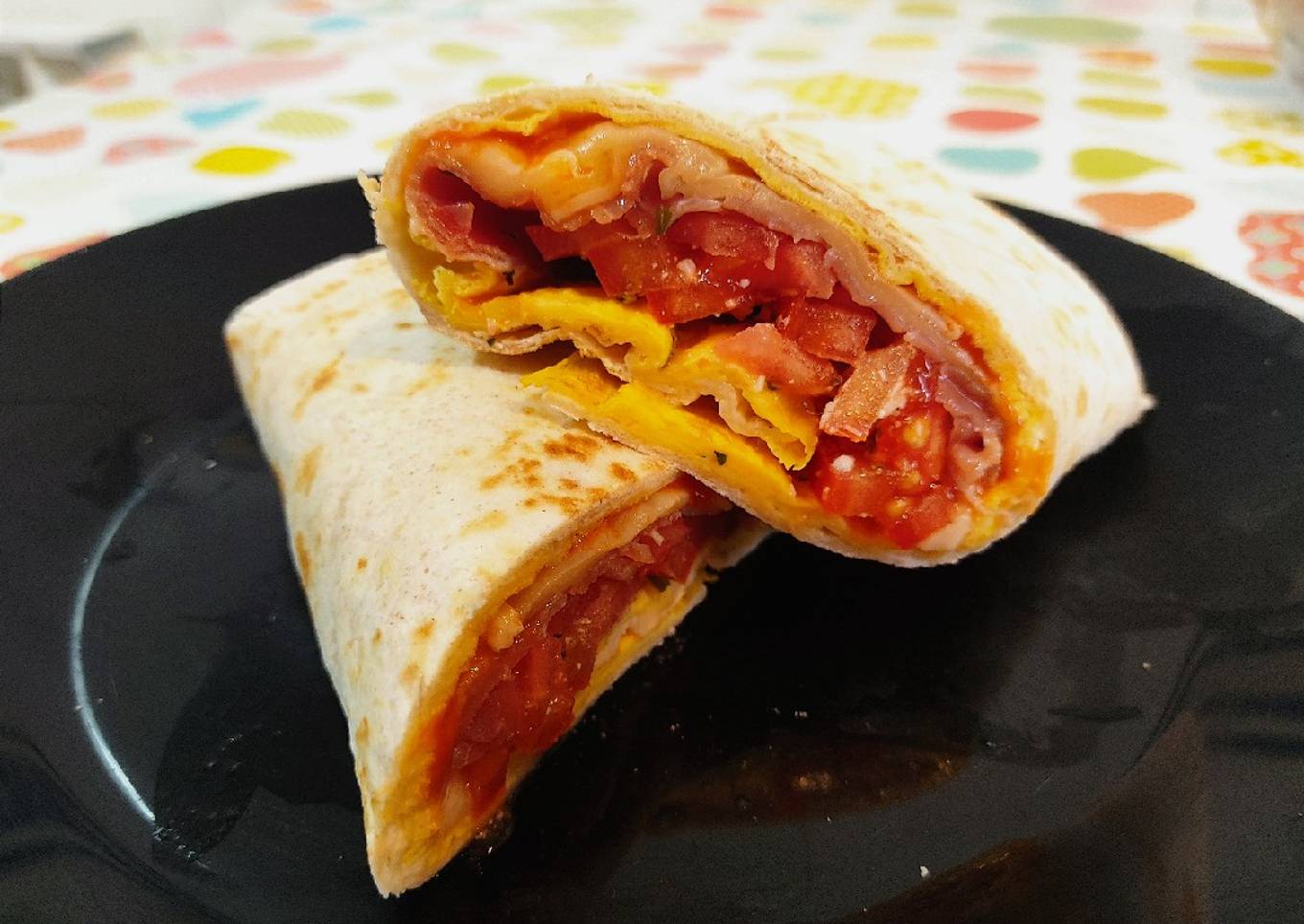 - Lavamos el tomate y lo cortamos en medias lunas finas. Ponemos una sart茅n al fuego engrasada con aceite, batimos un huevo y lo esparcimos bien por toda la superficie (como una tortilla francesa). Ponemos sobre el huevo una tortilla de trigo y cuando est茅 cuajado, le damos la vuelta. Bajamos el fuego y a帽adimos el queso en lonchas, jam贸n, tomate, queso parmesano y or茅gano.