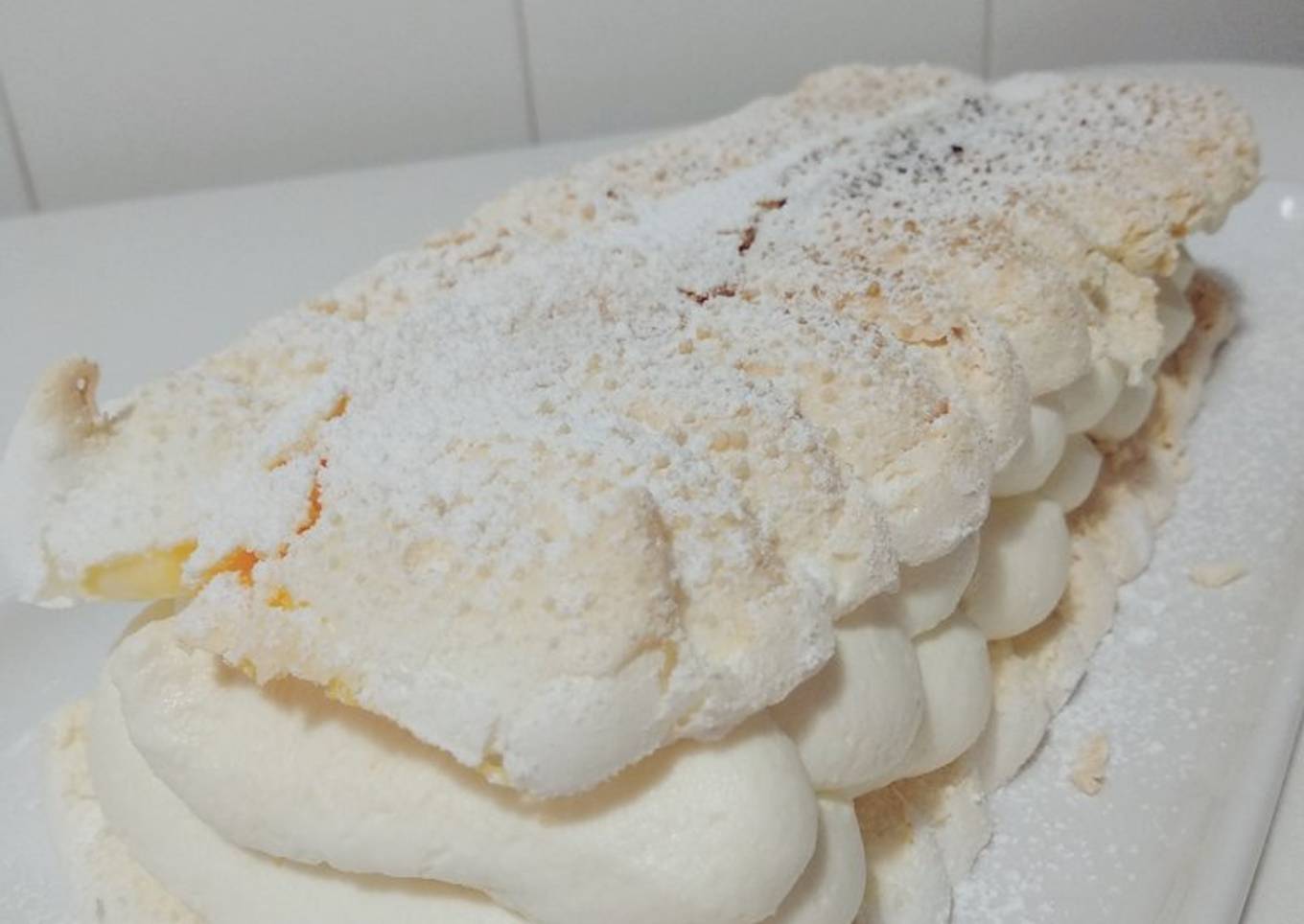 - Untamos con la nata, la parte superior del bizcocho y finalmente ponemos encima de la nata las otras tiras de bizcocho y merengue que habíamos hecho, para cerrar formando una especie de bocadillo.