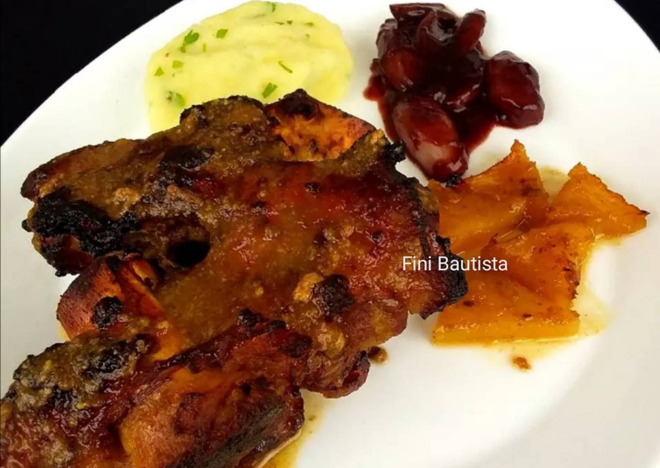 - Pasados estos 30 minutos le damos la vuelta los codillos volvemos a untar con el licuado de piña y horneamos 30 minutos más, a los 30 minutos volvemos a dar la vuelta a los codillos y de los mismos juegos que va soltando impregnamos los codillos horneamos 30 minutos más este procedimiento lo haremos hasta completar 2 horas de horneado, la patata iremos comprobando cada vez que saquemos la bandeja y en el momento que esté tierna la sacamos en mi caso tardaron una hora depende de su tamaño
