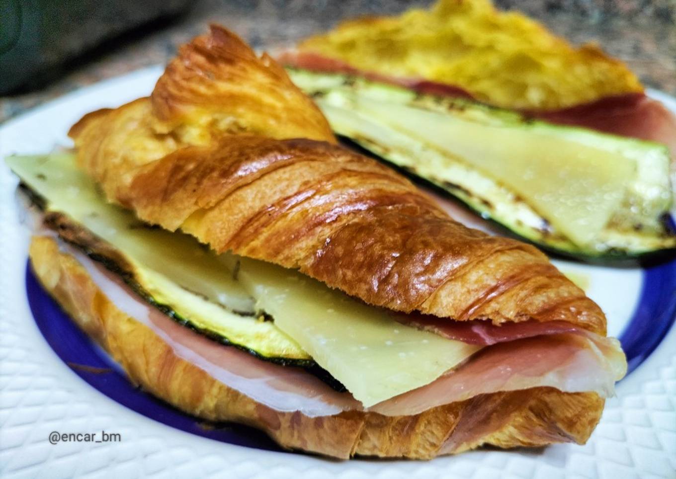 Hacer a la plancha con un hilo de aceite y una pizca de sal. - Abrir por la mitad los croissants, y poner el jamón, encima el calabacín, y por último el queso.