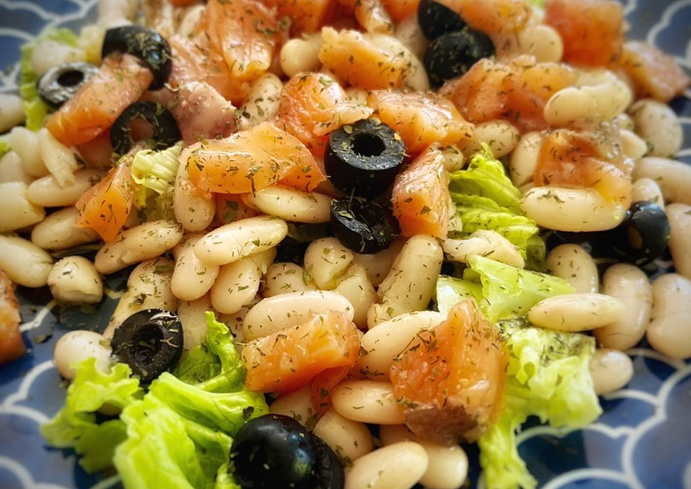 (Sumamos esta receta al reto de: crear tu ensalada🥗, donde nuestra base es: las monchetas, la proteína: el salmón, el topping: la lechuga y las aceitunas negras y, como salsa: una vinagreta especial —sin vinagre—).