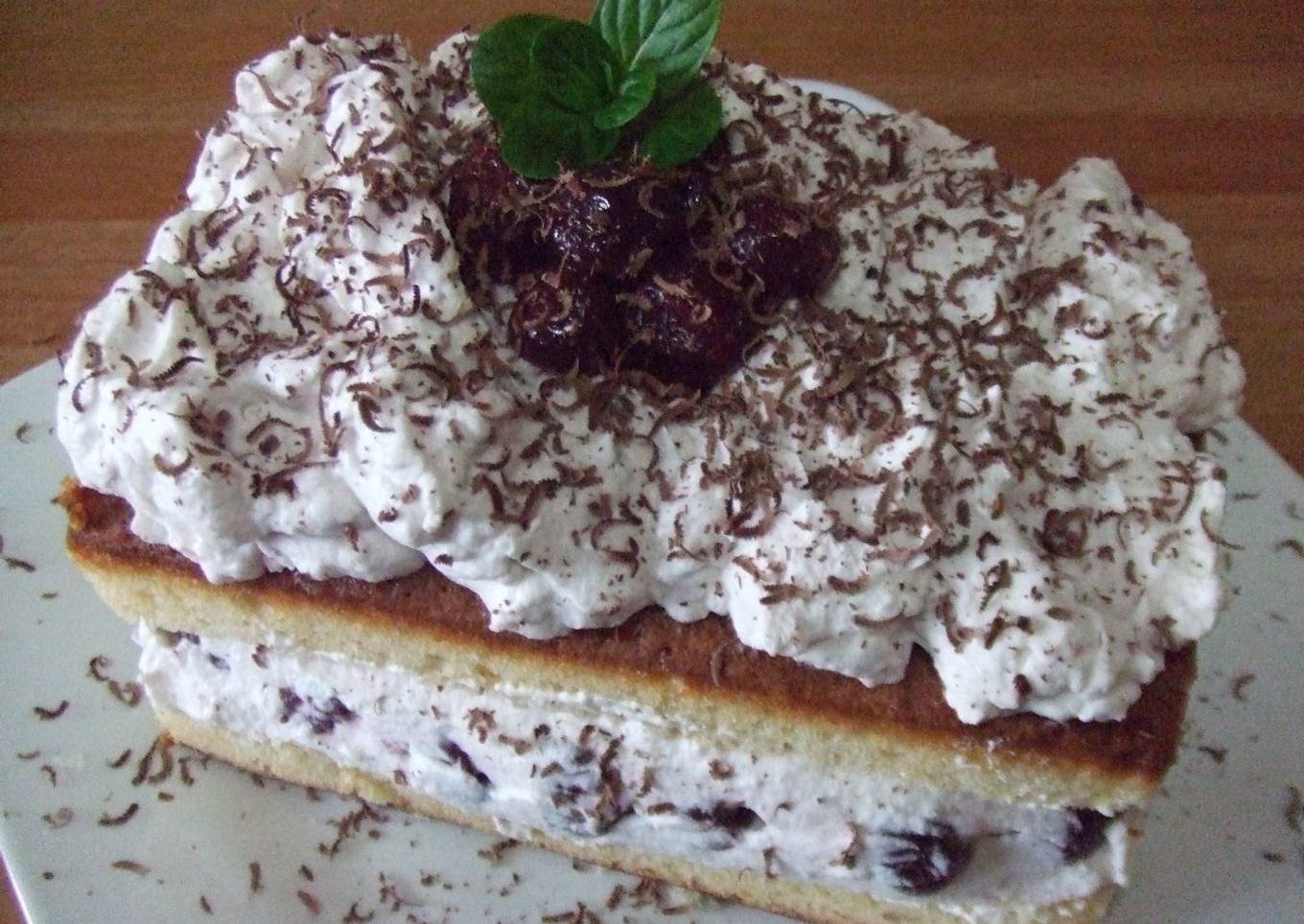 Bizcocho con cerezas, chantilly y chocolate