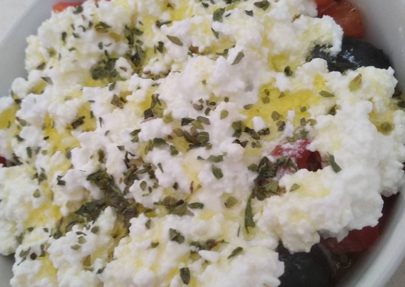 - Poner el pan en el fondo del bol. Añadir el tomate rallado y encima el tomate cortado a dados. Añadir la sal, las aceitunas, el queso y el orégano. Regar con aceite y listo.