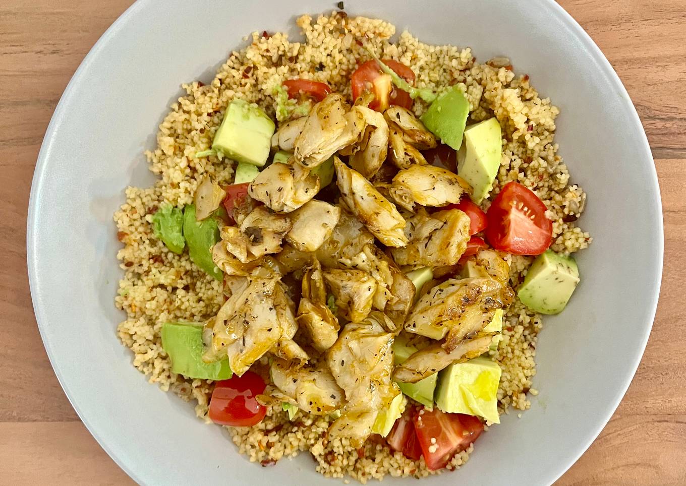 - Sirve el cous cous con el aguacate, el tomate y los bocados de Heura, y riega con un chorrito de aceite de oliva
