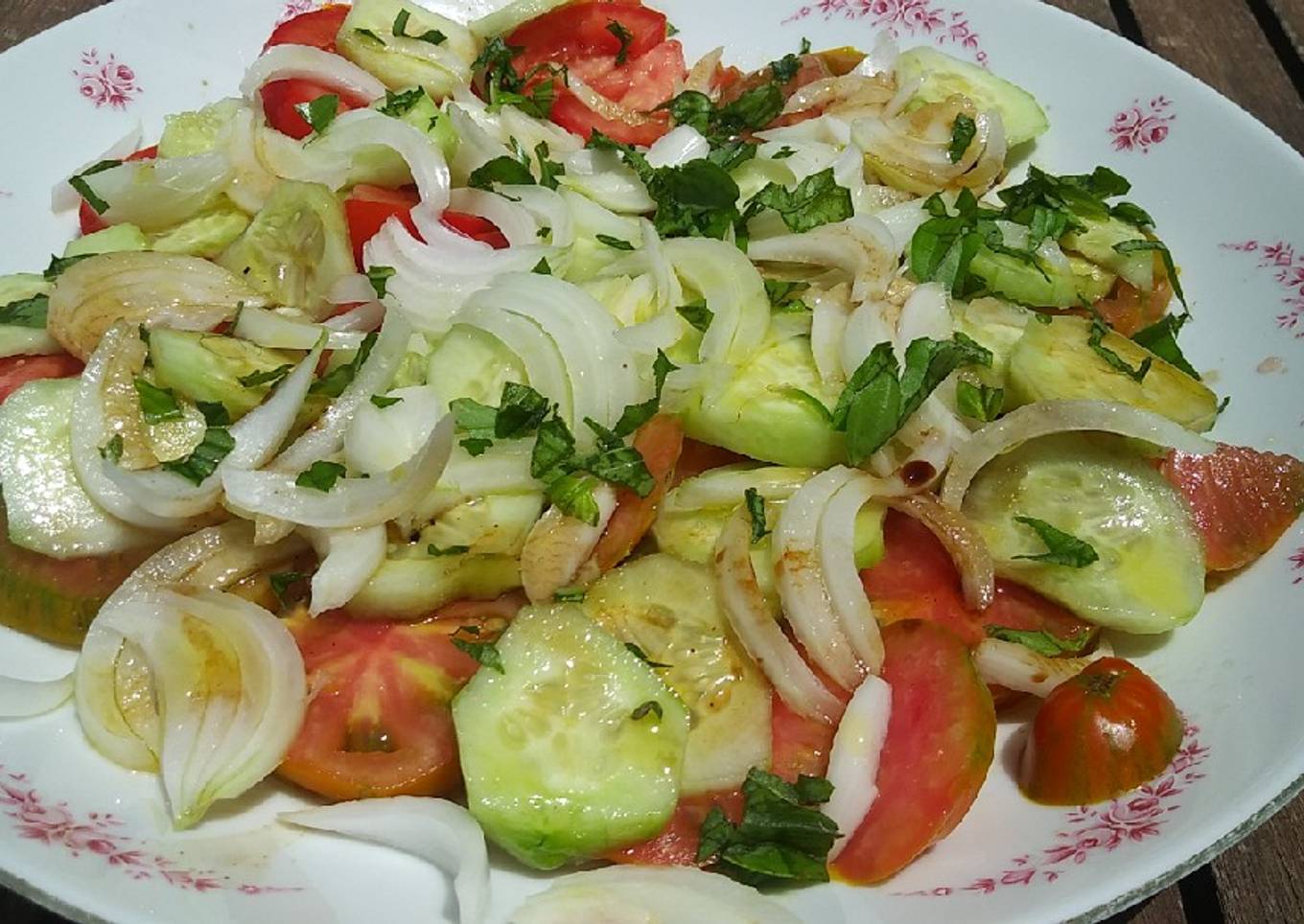 Es una receta muy simple y fresca para el verano. Solemos hacerla para acompañar a la sardinas a la plancha. Puede hacerse solo con tomate y albahaca o también con cebolla y/o pepino.
