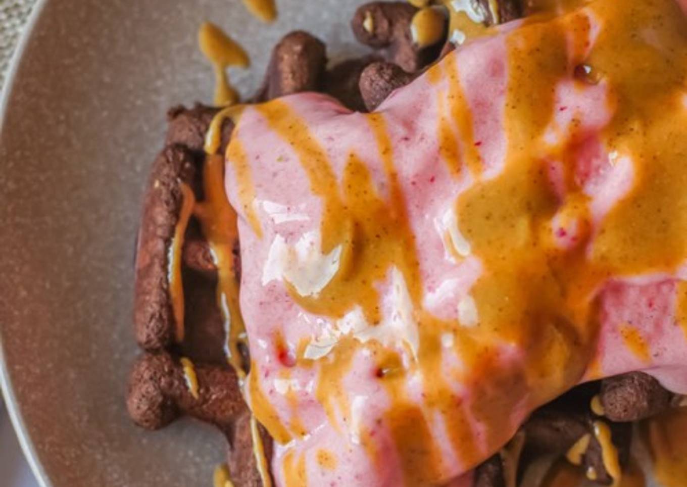 - Trituramos el pl谩tano, las fresas y el yogur hasta tener las texturas homog茅nea, vertemos sobre los gofres con 1 cda de crema de avellana y ¡a disfrutar!