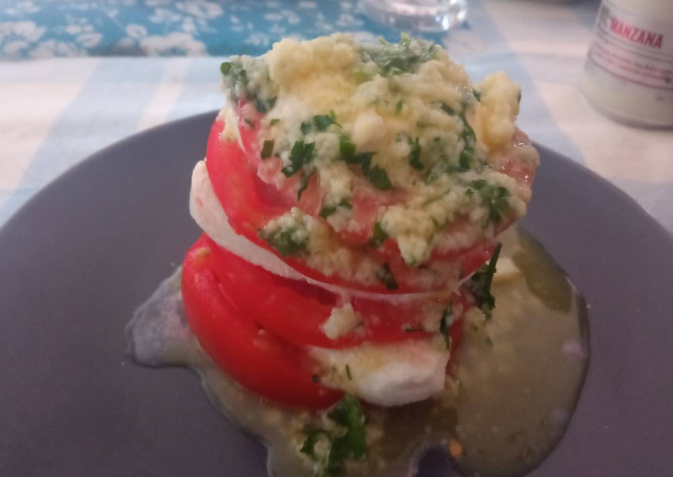 Lasaña fría de tomate y mozzarella con pesto de perejil