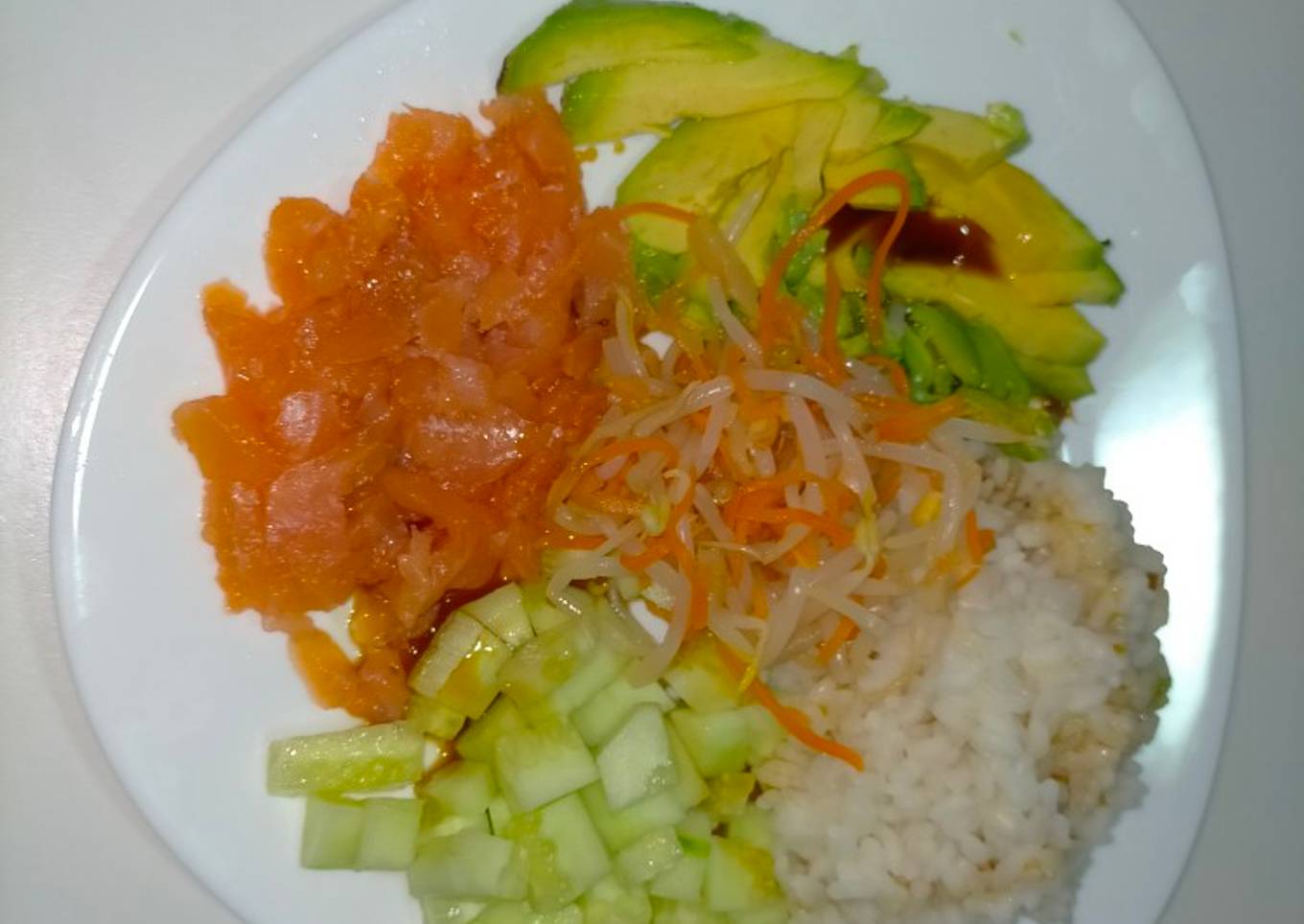- Cuando el arroz esté cocido lo emplatamos con el Salmón, pepino, aguacate y ensalada China que hemos preparado con anterioridad y listo para echarle salsa de soja al gusto y disfrutar.