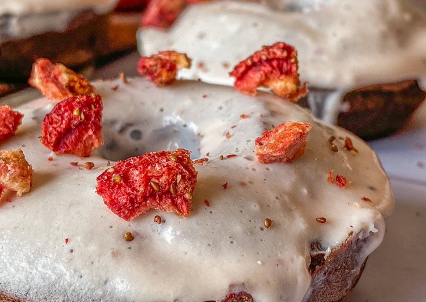 - Batimos las fresas con la leche y la leche en polvo hasta tener una textura homogéneo, bañamos nuestros donuts, decoramos con fresa deshidratada y ¡a disfrutar!