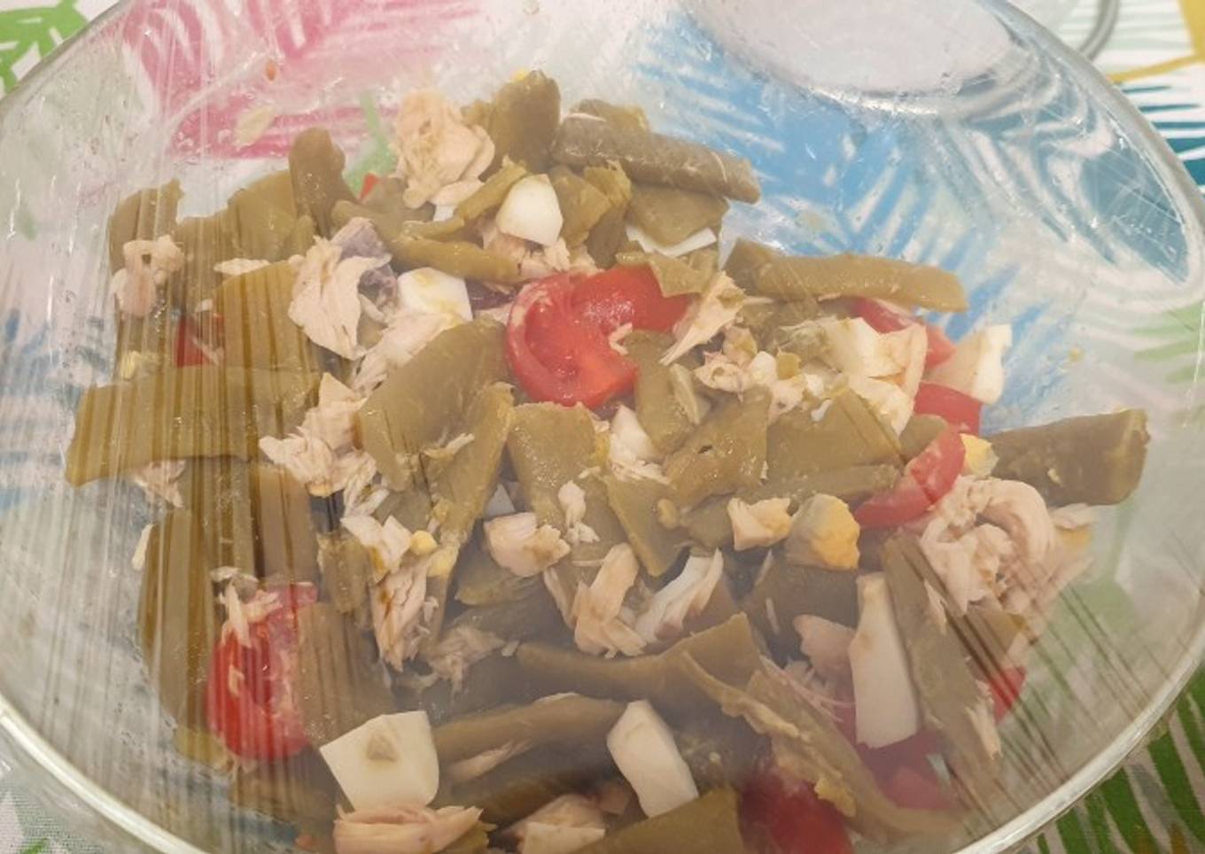 Ensalada de judías verdes, huevo duro, tomate y atún