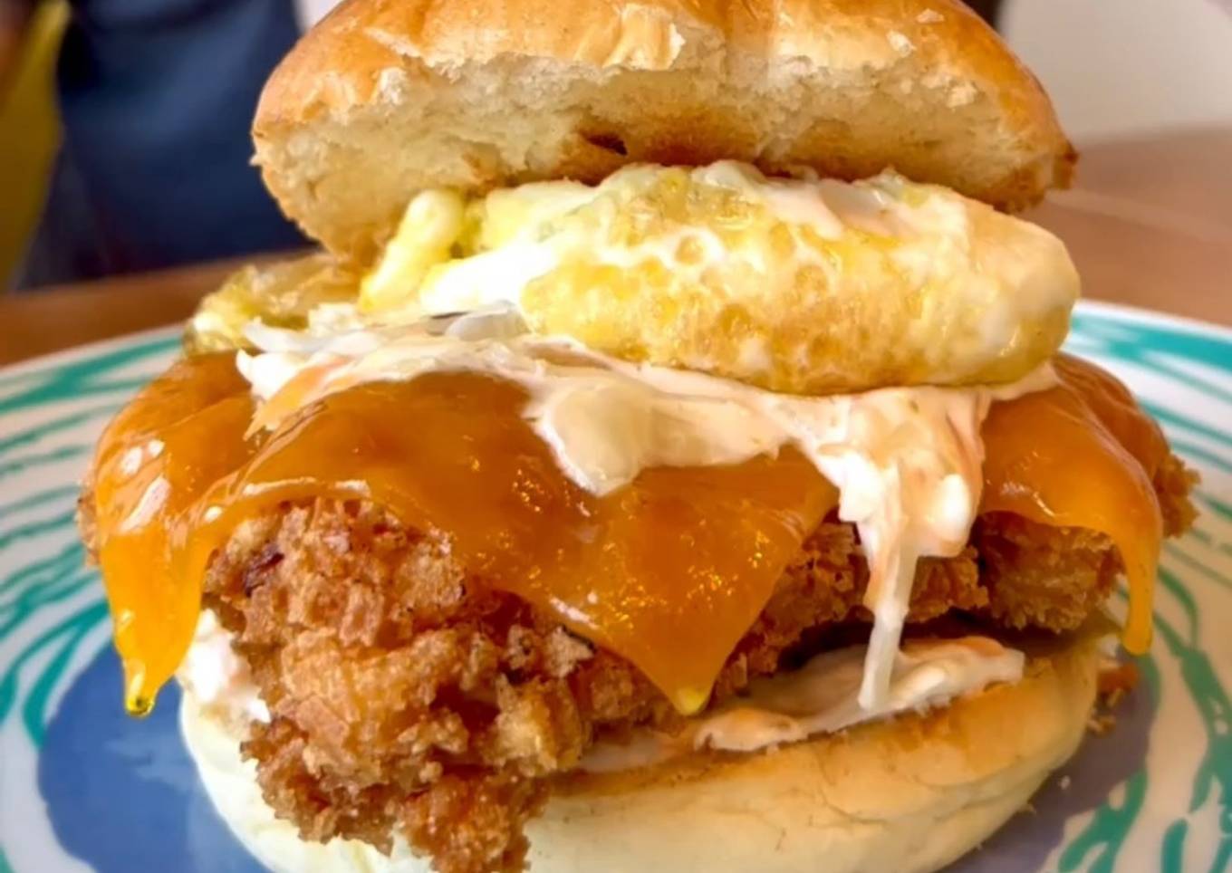 - Montamos la burger con ensalada de col, pepinillos, el pollo frito con queso y para hacerla bien epica, un huevo frito.