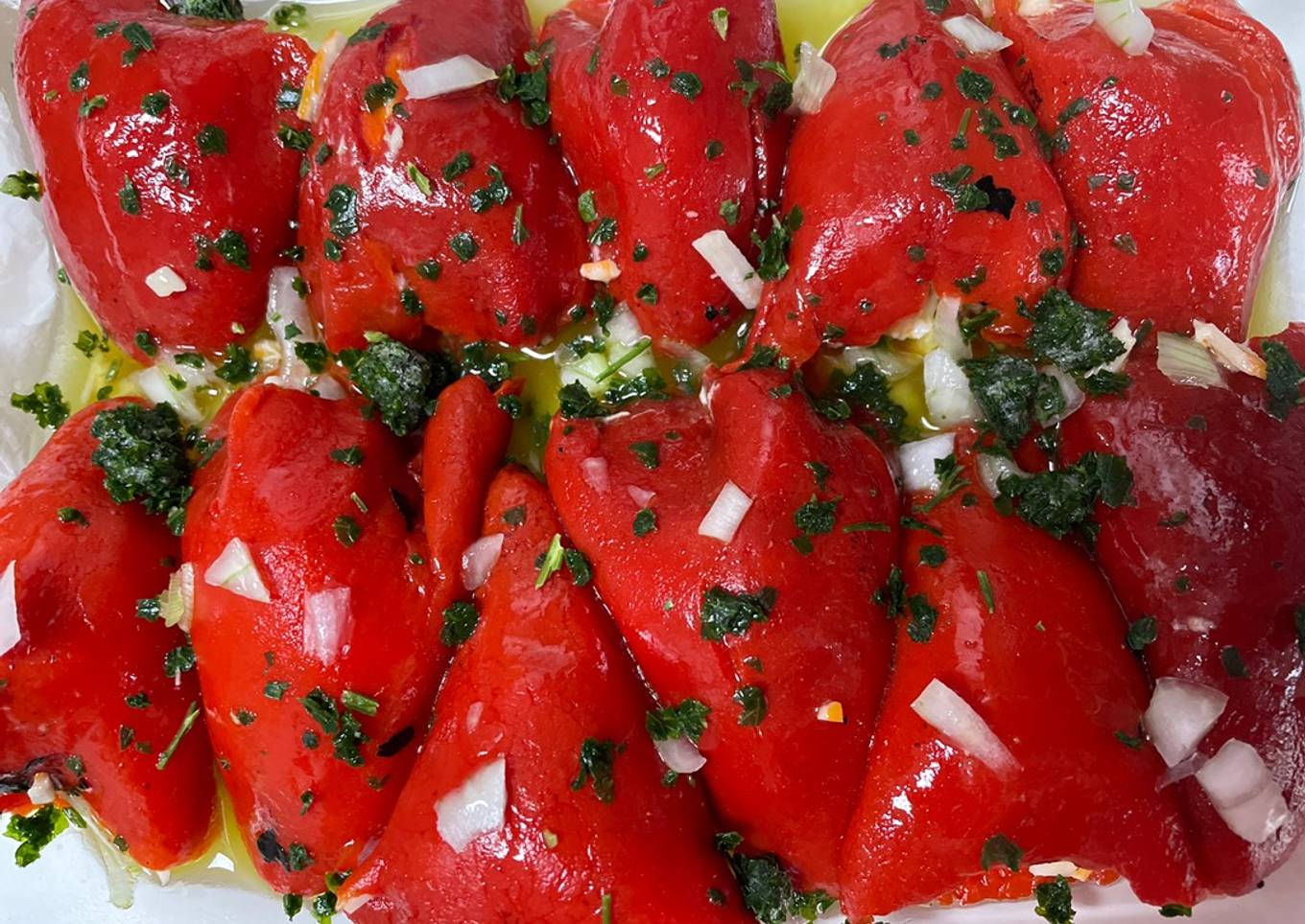 - Una vez que están todos los pimientos en la fuente echamos un poco de sal, cebolla picada, perejil y vinagreta que haremos mezclando seis cucharadas de aceite con dos de vinagre de manzana.