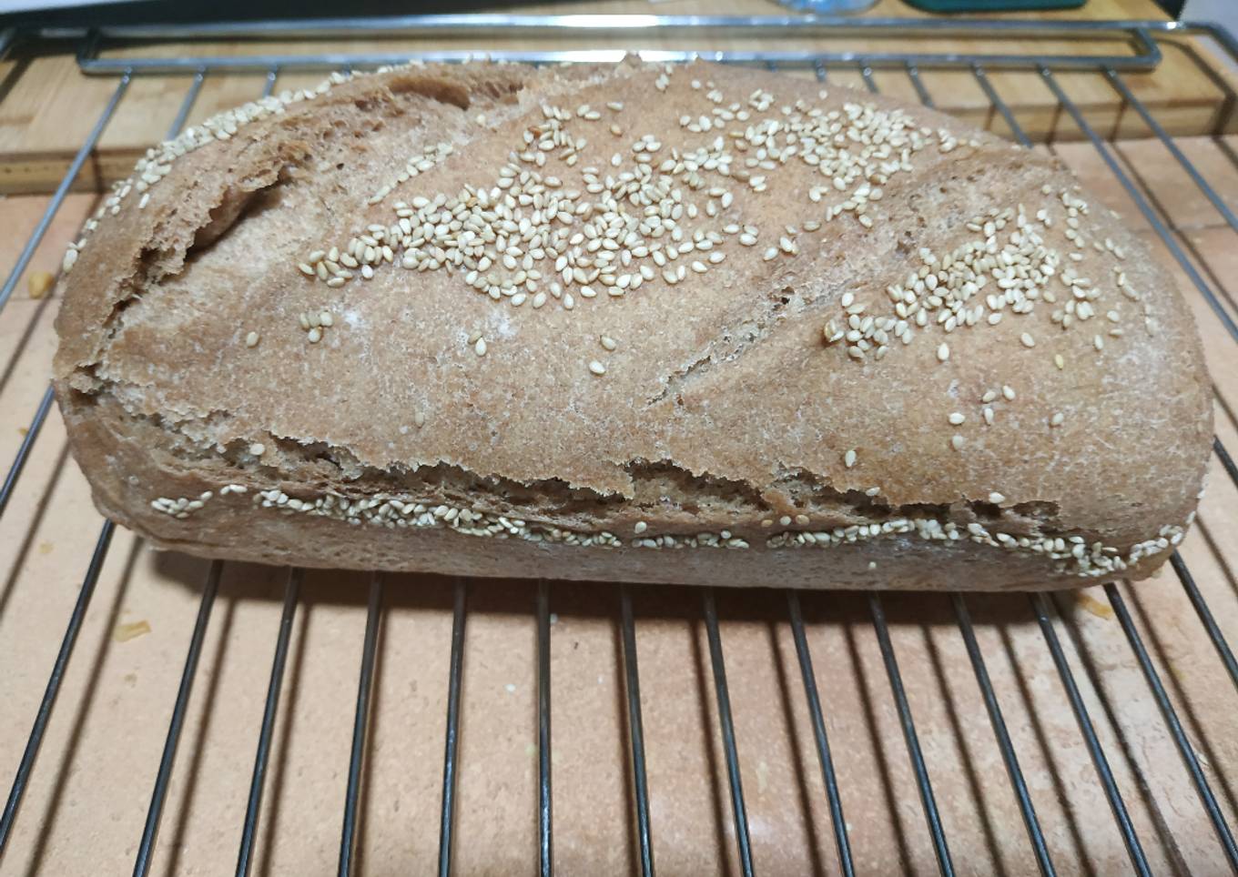 Un pan delicioso, con una miga compacta, ideal para tostadas, con ligero sabor amargo 😋🤤