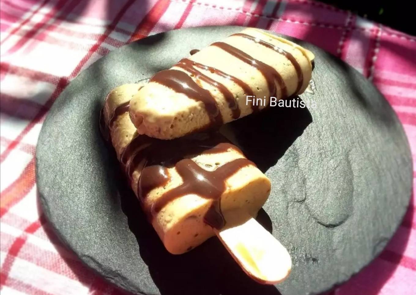 - Lo distribuimos en los recipientes para formar las paletas y reservamos en el congelador unas horas, en el momento de tomarlo poner unas hebras de sirope de chocolate