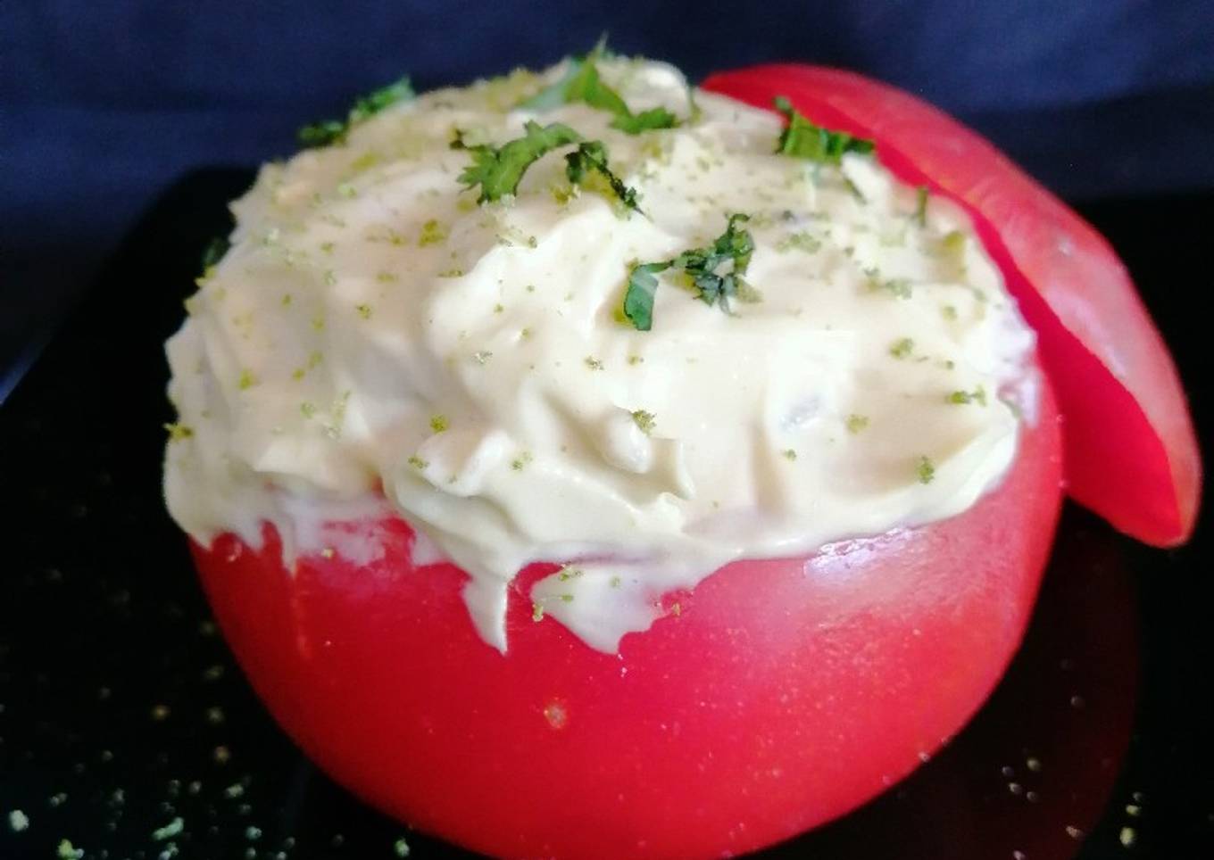 - Emplatar poniendo por encima del tomate un poco más de mayonesa, la ralladura de lima y el cilantro reservado.