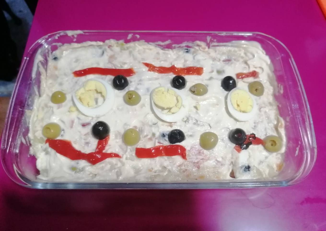 - Cortamos las aceitunas por la mitad y después finamente. Ponemos las patatas, el huevo, la zanahoria, las aceitunas y el pimiento del piquillo en un cuenco grande, agregamos los guisantes y el atún desmigado. Incorporamos la mayonesa, mezclamos suavemente. Por último probamos el punto de sal. Adornamos como más nos guste.