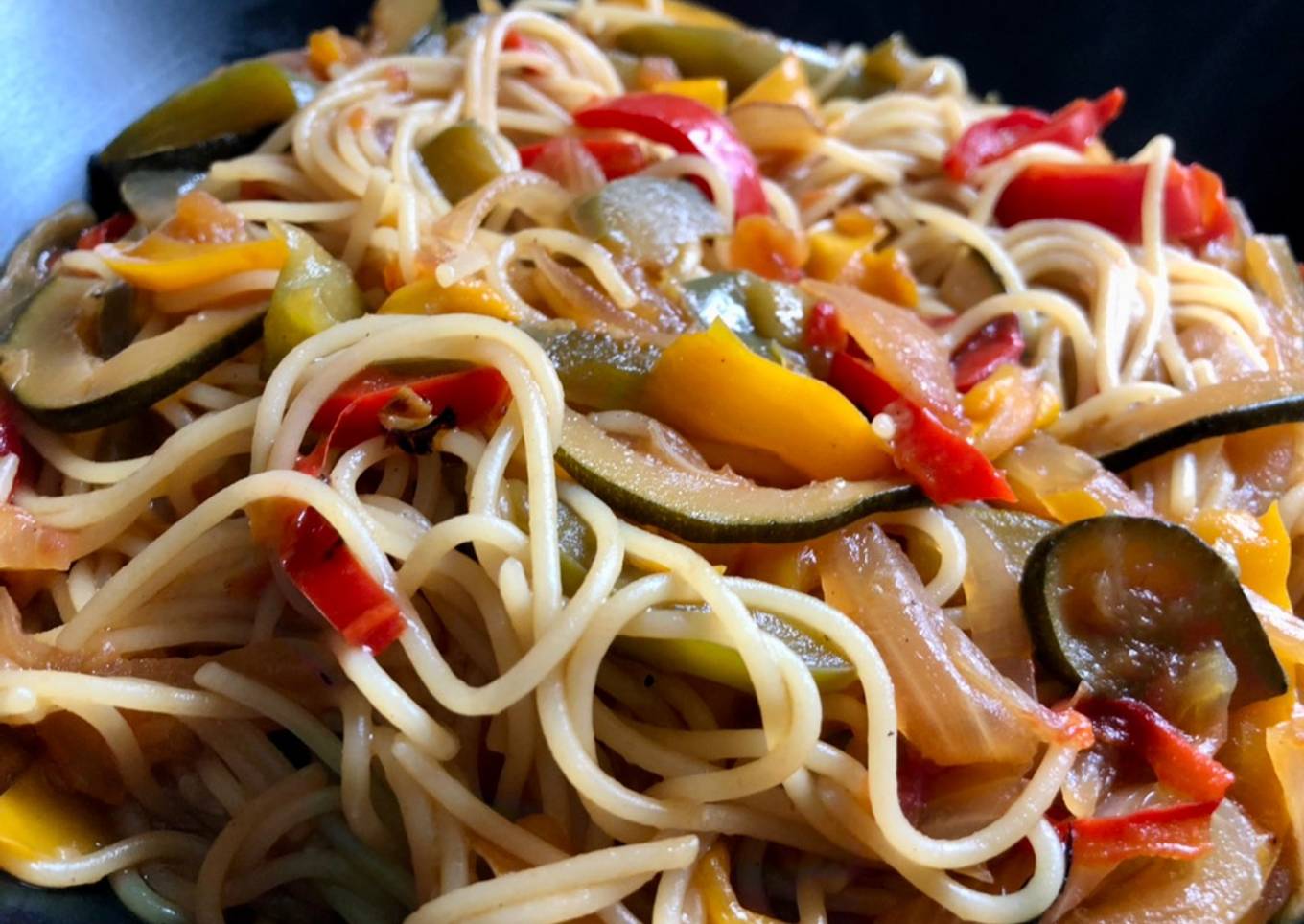 - Es un plato sencillo rápido y riquísimo, lo primero que haremos es cortar la verdura en juliana (en tiras), el tomate a dados y el calabacín por la mitad y en rodajas, en la sartén echamos un chorrito de aceite de oliva y echamos la verdura menos el calabacín y el tomate.