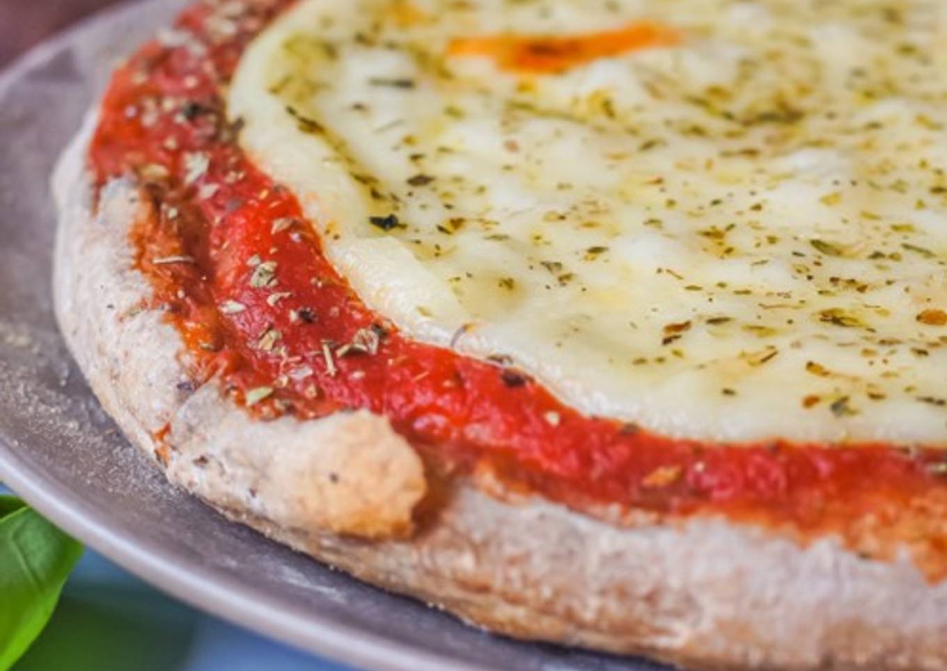 - Extendemos un poco la masa descongelada con ayuda del stendipizza, untamos con el tomate y colocamos el provolone con un poco de orégano espolvoreado