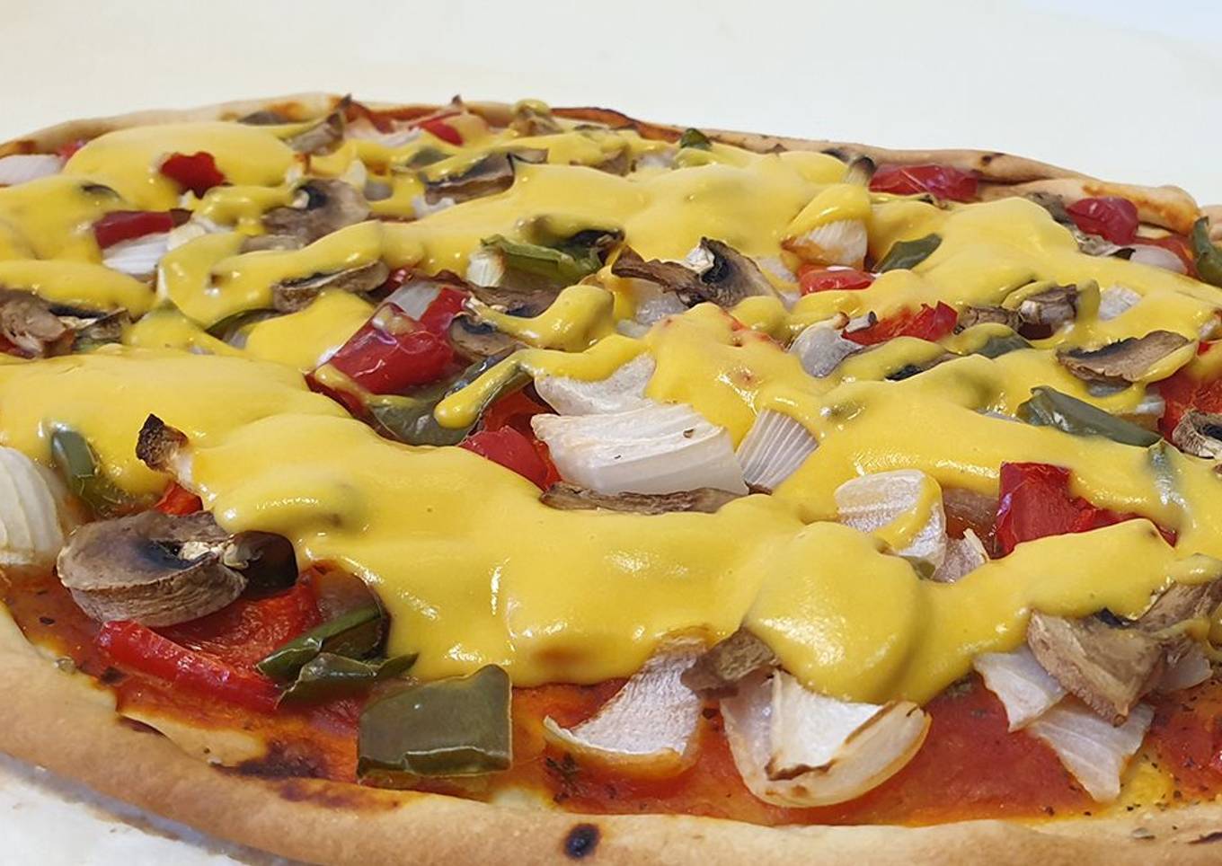 - Pasado ese tiempo, sacamos la pizza del horno, y añadimos por encima una salsa de queso cheddar vegano. Si quieres saber cómo preparar una salsa de queso cheddar vegano aquí te dejo la receta.