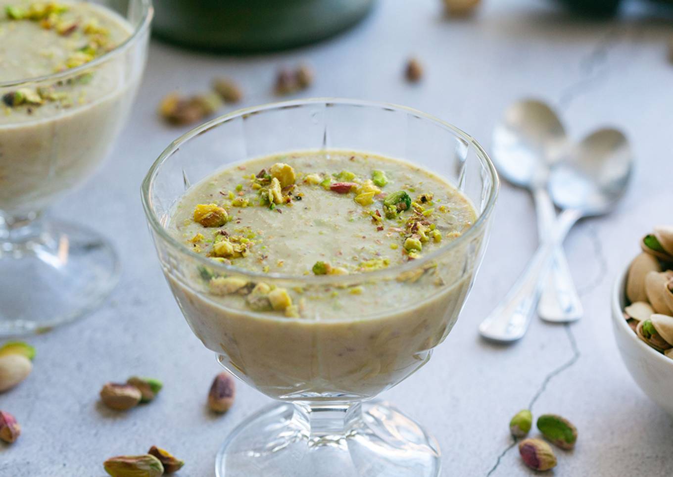 - Por un lado, ponemos la leche y los pistachos en una jarra de cristal y calentamos en el microondas durante un par de minutos a temperatura media. Lo pasamos al vaso de la batidora y trituramos. No pasa nada si queda algún trocito de pistacho. Reservamos.